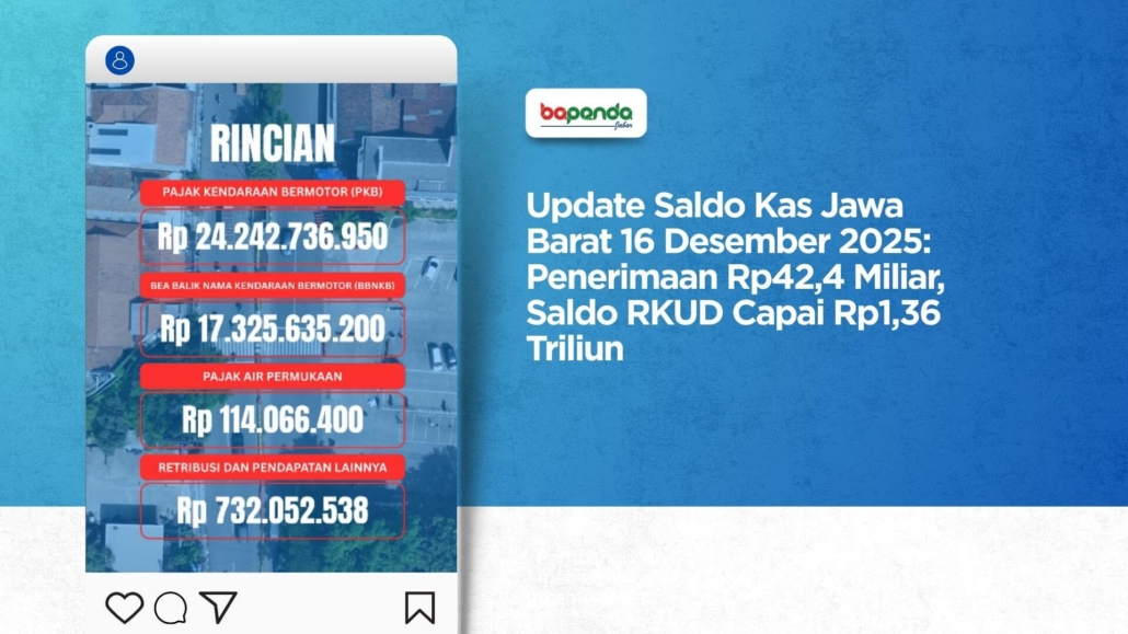Bandung — Pemerintah Provinsi Jawa Barat kembali menyampaikan laporan posisi saldo Kas Rekening Kas Umum Daerah (RKUD) sebagai bentuk transparansi pengelolaan keuangan daerah. Berdasarkan laporan yang diunggah di akun media sosial @dedimulyadiofficial, posisi saldo kas disampaikan pada Selasa, 16 Desember 2025, dengan realisasi penerimaan hingga pukul 17.00 WIB mencapai Rp42.414.491.088.